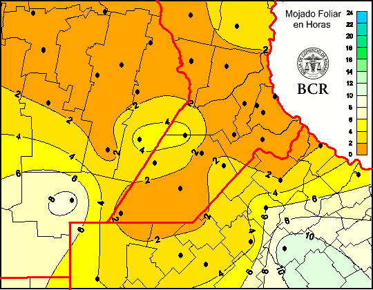 Mapa de cantidad de horas de mojado foliar en las últimas 24 horas.