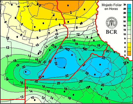 Mapa de cantidad de horas de mojado foliar en las últimas 24 horas.