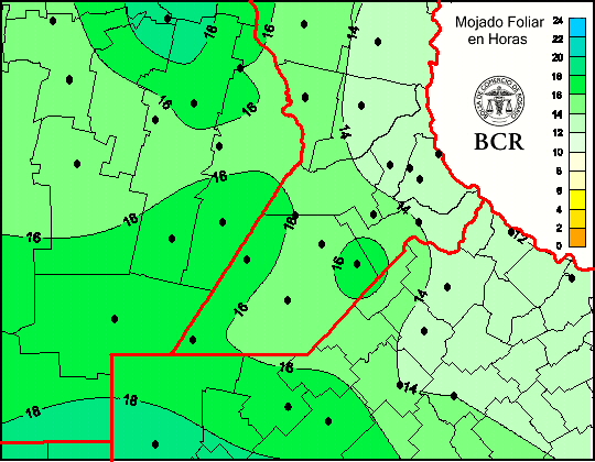 Mapa de cantidad de horas de mojado foliar en las últimas 24 horas.