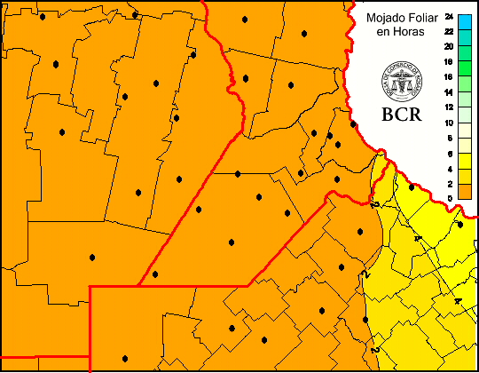Mapa de cantidad de horas de mojado foliar en las últimas 24 horas.