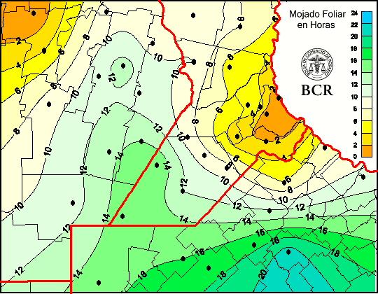 Mapa de cantidad de horas de mojado foliar en las últimas 24 horas.