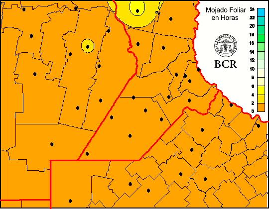 Mapa de cantidad de horas de mojado foliar en las últimas 24 horas.