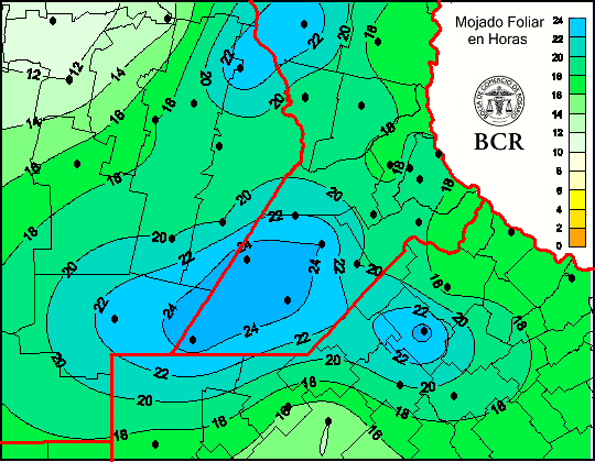Mapa de cantidad de horas de mojado foliar en las últimas 24 horas.