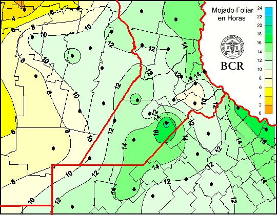 Mapa de cantidad de horas de mojado foliar en las últimas 24 horas.