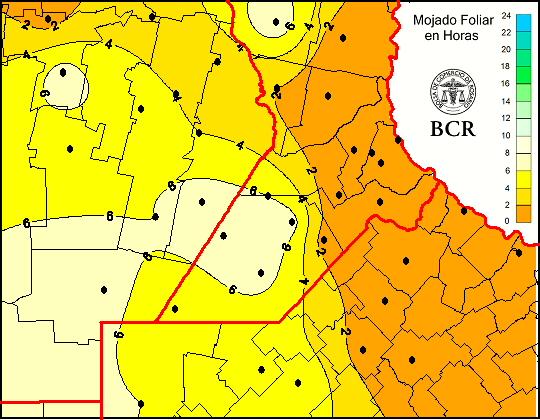 Mapa de cantidad de horas de mojado foliar en las últimas 24 horas.