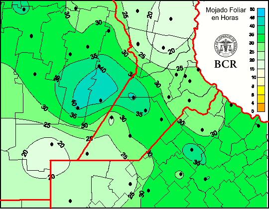 Mapa de cantidad de horas de mojado foliar en las últimas 24 horas.