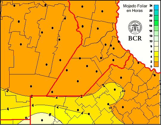 Mapa de cantidad de horas de mojado foliar en las últimas 24 horas.
