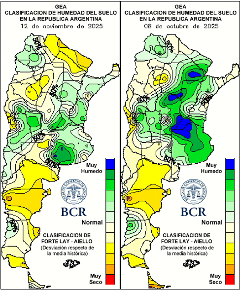 Aparte de las excelentes condiciones de humedad a la siembra en el otoño, las lluvias inéditas de julio y, sobre todo, las de agosto, hubo también excelentes condiciones de llenado en buena parte de la región pampeana. Las lluvias siguieron consolidándose en noviembre, como se observa en las imágenes que comparan las anomalías de reservas para Argentina del 12 de noviembre respecto de las de hace un mes.