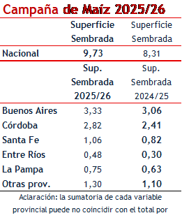 El avance de la siembra es de un 40% cuando un año atrás era del 36%. Con tormentas semanales y cierto respiro en el centro del país, y con retrasos y una siembra muy trabada sobre Buenos Aires, en noviembre se sembraron casi 3,9 M ha de las 9,7 que se intencionan. Hay que aclarar que para la cosecha del circuito comercial se consideran 8,0 M de ha. De esta manera la producción rondaría los 61 Mt, cifra inédita para Argentina. Los técnicos destacan el muy buen estado del maíz sembrado.
