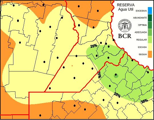 A raíz de la distribución que presentaron las precipitaciones durante la primera quincena del mes tenemos una región pampeana dividida exactamente a la mitad. La parte norte se llevó toda la carga de agua y allí, en quince días, prácticamente se han alcanzado los valores medios estadísticos de todo octubre. La mitad sur, por el contrario, casi no recibió lluvias, acentuando la deprimida condición hídrica que presentan sus perfiles, principalmente en el sector sudoeste. La excelente cuota de agua que se descargó sobre las regiones mencionadas ha permitido una significativa recuperación de las reservas a nivel superficial, aunque todavía insuficiente para recomponer a niveles óptimos la humedad de todo el perfil.