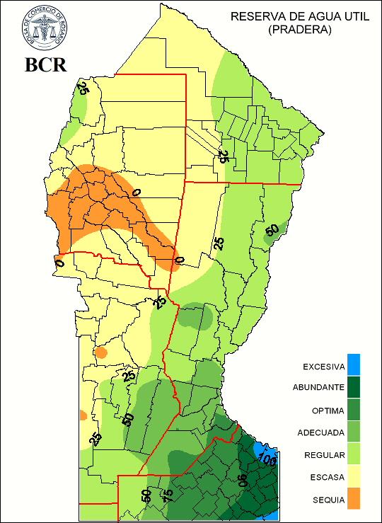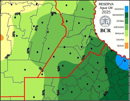 Como resultado de esta alternancia de corrientes de aire y la presencia de un ambiente saturado de humedad, las reservas de agua se mantienen de buenas a muy buenas sobre la mayor parte de la región pampeana. Se sigue marcando el contraste entre la franja este, mucho mejor provista, y la oeste con niveles de escasez y sequía. Esta condición se profundiza hacia el NOA que actualmente esta transitando su estación seca.