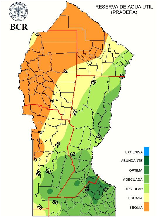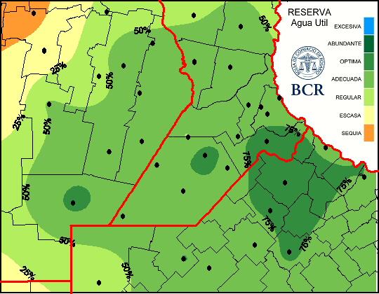 Con este panorama las reservas disminuyeron respecto de la semana pasada. En el centro de la zona GEA las condiciones óptimas se redujeron y se mantienen adecuadas, disminuyendo hacia el noroeste donde alcanzan niveles de escasez a sequía.