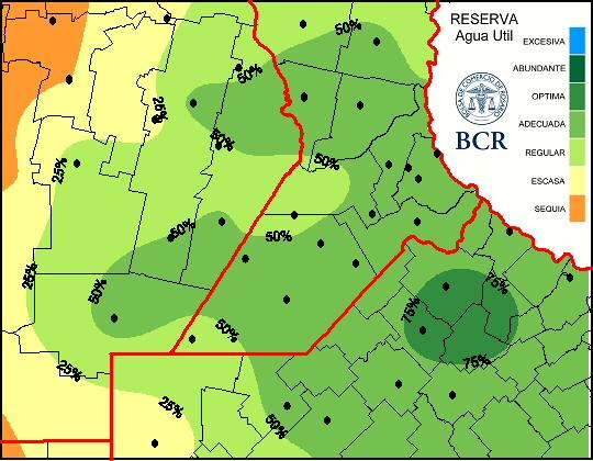 Con este panorama, las reservas de humedad mostraron una leve disminución respecto de la semana anterior, especialmente en el centro de la zona GEA, donde ahora los niveles son regulares. En el sector sudeste aún persiste un núcleo de condiciones óptimas, mientras que hacia el oeste se mantienen las reservas escasas, llegando a situación de sequía en el noroeste.