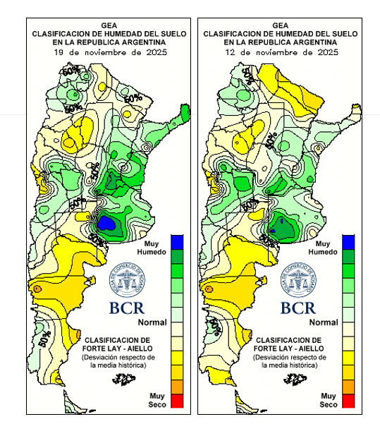 La siembra de soja de primera en la región núcleo avanza al 70%, pero se mantiene muy por detrás de los ritmos históricos: 25 p.p. menos que el año pasado y 18 por debajo del promedio de las últimas cinco campañas. Aún falta implantar cerca de 1 M ha y las lluvias del fin de semana volvieron a frenar las labores justo cuando la ventana óptima de siembra empieza a estrecharse, ya que se extiende hasta el 20 de noviembre. En Aldao, en el centro-sur santafesino, advierten: “vos sembras y el cultivo necesita al menos una semana para emerger. Pero en el medio te caen 40 mm. Cada 3 o 4 días estamos teniendo que interrumpir las labores por las lluvias. Y te agarra sí o sí con algún lote sembrado de soja sin emerger que no sabes si lo tenés que volver a sembrar”. En San Pedro, noreste de Buenos Aires, el avance no supera el 15% y hacia el sur de Junín advierten que están muy demorados. El nuevo frente previsto para este jueves amenaza con dejar unas 600.000 ha al borde de salir de la ventana donde se obtienen los máximos rendimientos. En contraste, en el noroeste bonaerense —como en General Pinto— destacan que el suelo se orea rápidamente gracias al viento y las altas temperaturas, permitiendo retomar pronto la siembra. En el sur y centro-sur de Santa Fe, como Carlos Pellegrini y Bigand, tienen entre un 80 a 90% del área ya implantada y la mayoría de los productores están en condiciones de finalizar dentro del período óptimo. En Marcos Juárez, restan pocos lotes y se espera completarlos durante esta semana.