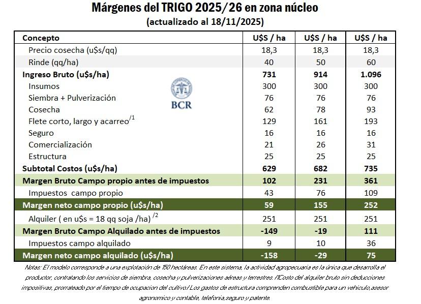 Con un precio a cosecha (diciembre) de 18,3 u$s/qq, para campo alquilado el punto de equilibrio llega recién con rindes altos: con 40 qq/ha la pérdida es de 158 u$s/ha; con 50 qq/ha aún sigue en negativo (–29 u$s/ha); y recién con 60 qq/ha se pasa a terreno positivo (75 u$s/ha). El costo del alquiler —equivalente a 18 qq/ha de soja en este análisis y prorrateado por el tiempo de ocupación del cultivo— resulta determinante y deja al trigo expuesto a un riesgo económico considerable cuando los rindes están por debajo de niveles promedios para la zona (38 qq/ha). En el caso de campo propio, pasar de 40 a 60 qq/ha lleva el margen neto de 59 a 252 u$s/ha, más de cuatro veces.