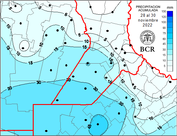 Las lluvias se concentraron sobre el noroeste de Buenos Aires, extremo SO de Santa FE y SE cordobés. Se destacan Lincoln (Bs As) con 48,6 mm y Rufino (S Fe) con 42 mm.