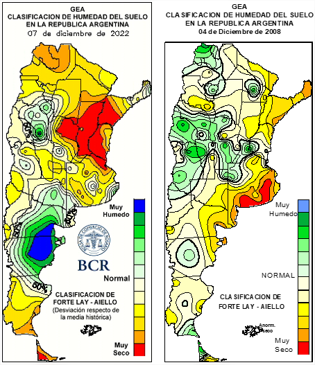 La última actualización de reservas hídricas al 7 de diciembre es 2022 es alarmante. Con la última semana de temperaturas con máximas de 40°C, viento, y baja humedad relativa, la demanda atmosférica ha intensificado la desecación de los suelos. De esta forma, casi la totalidad de Santa Fe está en la categoría más grave de sequía. Como es un mapa de anomalía, lo que refleja es que la provincia tiene las peores reservas hídricas respecto de los valores normales estadísticos de los últimos 30 años. Lo mismo se refleja para la mitad norte de Córdoba, Entre Ríos, Corrientes y el NE bonaerense. Al comparar con la misma situación del 2008, se nota como las lluvias de finales de noviembre y principios de diciembre llegaban oportunamente en aquel entonces para mejorar las condiciones de los cultivos y seguir con las siembras. En cambio, hoy lo que se observa es que Argentina transita la campaña gruesa con las peores condiciones climáticas de al menos los últimos 30 años.