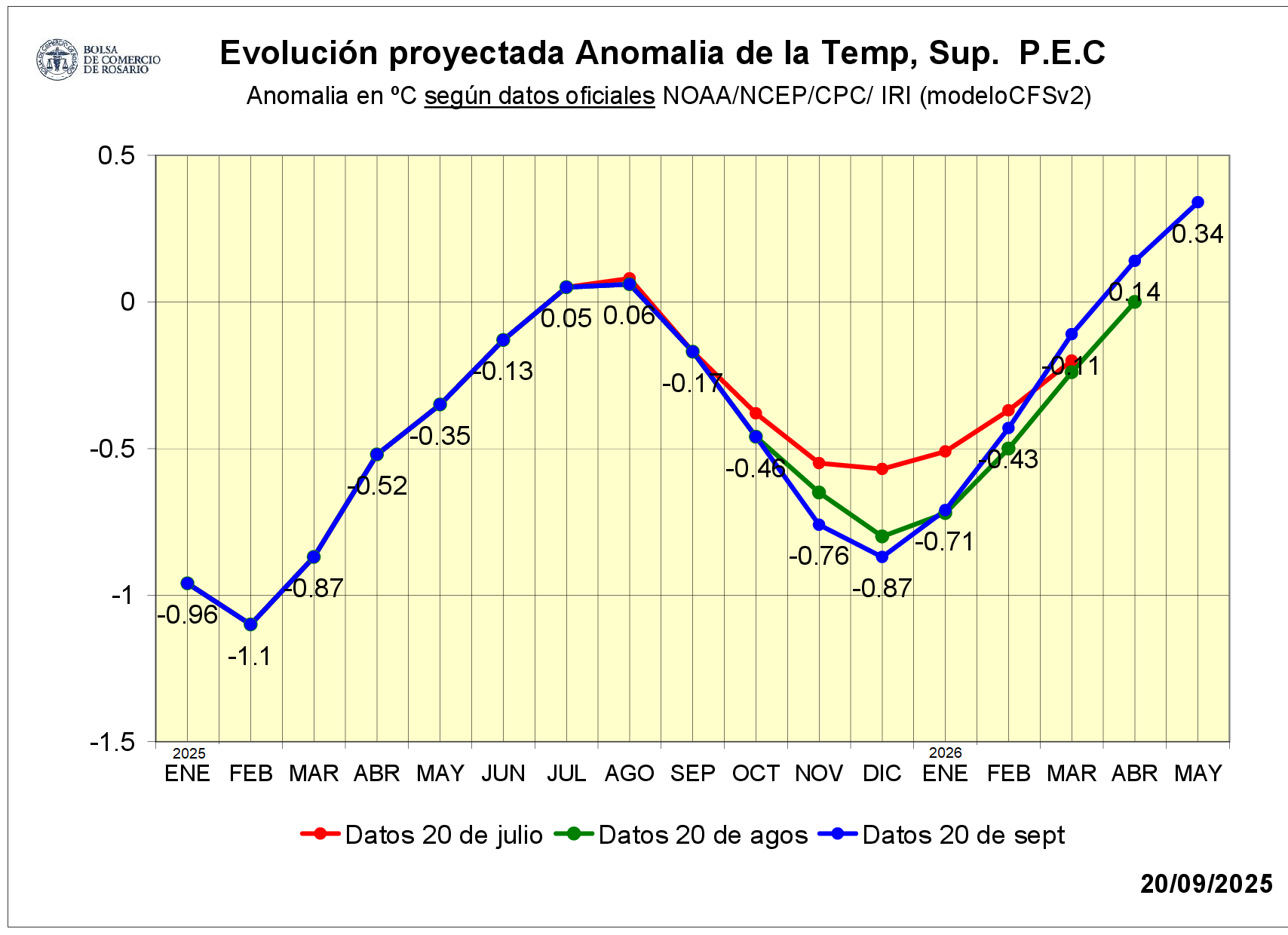 Con la siembra maicera en Argentina en marcha, peleando contra los excesos y buscando llegar a los lotes entre las tormentas que han ganado frecuencia semanal, la NOAA muestra una anomalía de la SST (temperatura superficial del mar) con un actual valor (setiembre) de -0,4, o sea casi saliendo de Neutralidad. La diferencia respecto a un mes atrás, es que la evolución proyectada de la anomalía en el mes de setiembre versus lo proyectado en agosto muestra valores de enfriamiento levemente mayores por debajo del umbral de -0,5. En agosto el valor más bajo se preveía en -0,8 para diciembre. Ahora, en setiembre, se observa un valor de -0,87. Este mayor enfriamiento también se nota en noviembre: -0,76 (vs -0.65). Pero no para enero: -0,71 ahora contra -0,72 hace un mes. ¿Qué significan estos números? Primero, que se ratifican valores de una probable Niña de intensidad leve y corta duración. Lo segundo es que “el rebote”, la vuelta a Neutralidad, se estaría acelerando y dando antes de que termine enero 2026. De hecho, para febrero 2026 se proyecta un valor de -0,43 (vs -0,5 proyectado en agosto). Entre los meses de enero y mayo del 2026 se hace evidente un calentamiento muy sostenido que invita a preguntarse si no es un “Niño” lo próximo que puede estar caracterizando a la fase del Pacífico.