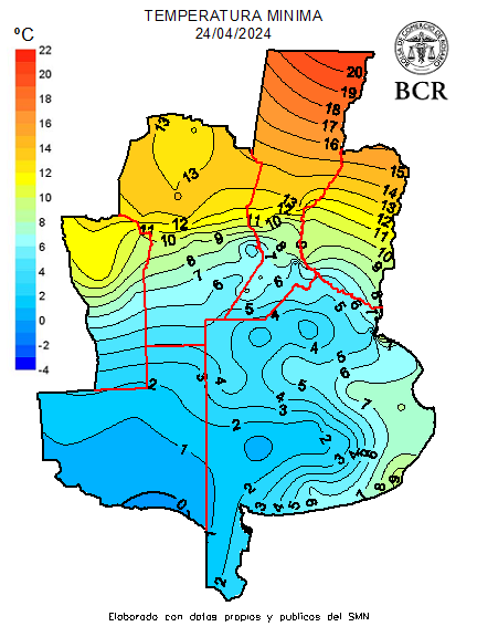 En la región núcleo, el detalle de las estaciones de la red GEA/BCR muestra los menores en el norte de Buenos Aires: Chacabuco registró 2,2°C; General Pinto 2,3°C y Lincoln 3°C. En el resto de la región, los registros superan el umbral de sobrevivencia de la chicharrita, estando por encima de los 4°C.