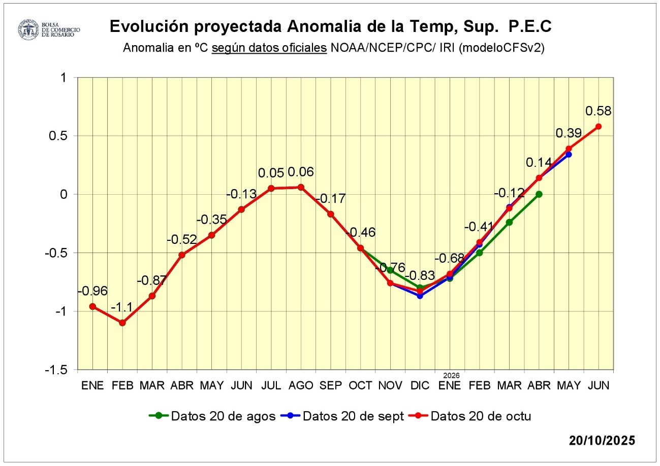 La NOAA muestra una anomalía de la SST (temperatura superficial del mar) con un actual valor (octubre) de -0,6. La diferencia respecto a un mes atrás, es que la evolución proyectada de la anomalía en el mes de diciembre versus lo proyectado en septiembre muestra un valor de enfriamiento levemente menor. En setiembre se preveía el valor más bajo en -0,87 para diciembre. Con los datos de octubre, se observa un retroceso con un valor de -0,84.