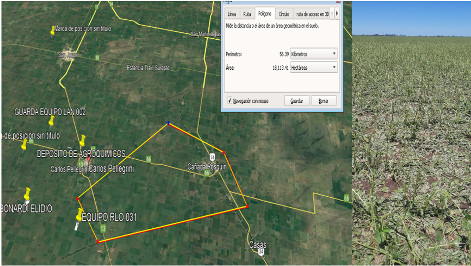 El polígono marcado muestra que el área afectada abarcaría 18.000 ha. “No todo fue afectado en la misma magnitud”. Pero aparte, hubo otra manga más: “en el norte de Pellegrini no fue tan ancha, pero hemos visto los mismo niveles de daños”.