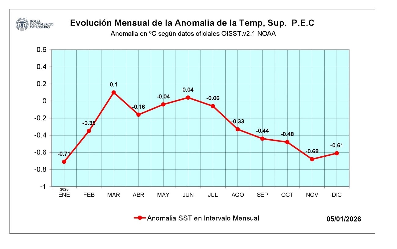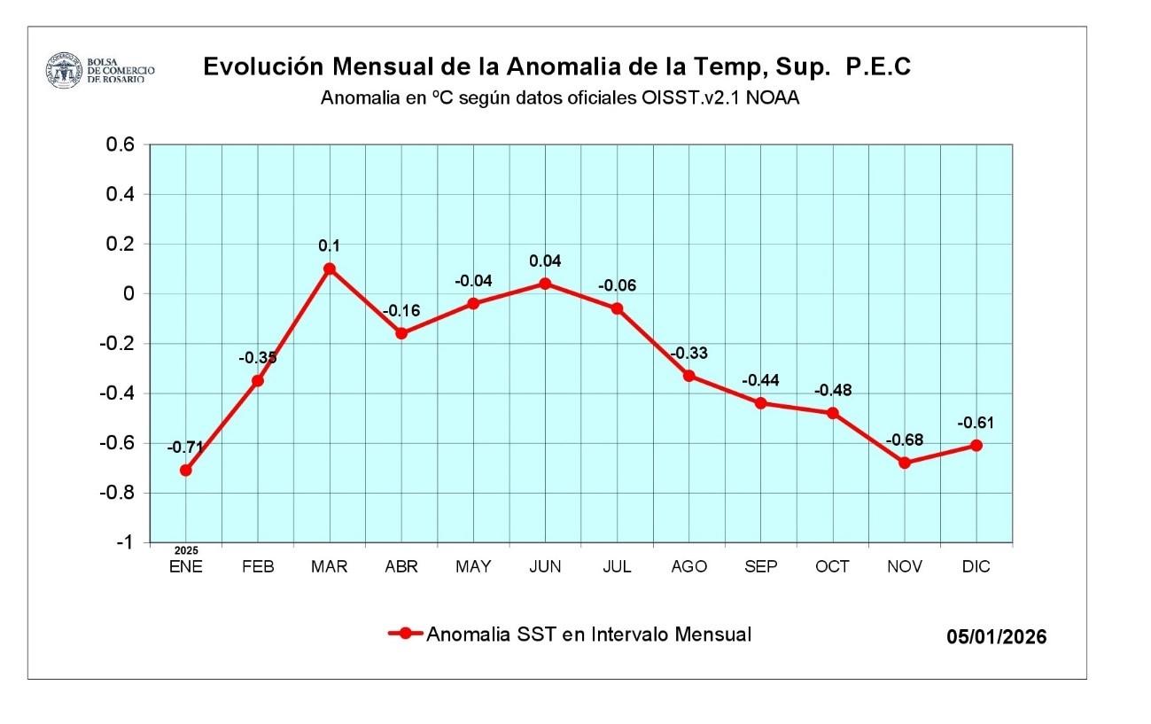 La evolución mensual de la anomalía de la temperatura superficial en el Pacífico (SST) muestra que “La Niña” ya tocó su valor mínimo de -0,68 hace un mes atrás, para pasar recientemente a -0,61 en una clara tendencia hacia la neutralidad. Esto descarta la posibilidad de que “La Niña” pueda tener influencia en las lluvias de enero y febrero en Argentina. De esta manera se está cumpliendo lo proyectado: una Niña corta y débil que apenas afectaría el régimen pluviométrico. Incluso, en la última semana del año, cuando el posicionamiento del anticiclón semipermanente del Atlántico provocó en la región central ausencia de precipitaciones, la humedad siguió llegando a Argentina con lluvias altamente significativas en el norte del país.