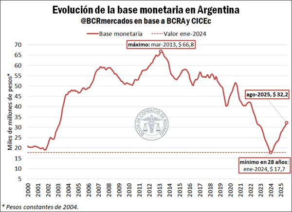 En este marco, para analizar la evolución histórica de la base monetaria en Argentina, se toman como referencia los datos publicados por el BCRA, los cuales fueron filtrados por estacionalidad e irregulares extremos por el CICEc, y se encuentran expresados en pesos constantes de 2004. A partir de los mismos, se evidencia que en enero de 2024 la base monetaria alcanzó su menor valor en 28 años, esto es, un piso desde enero de 1996. Desde entonces, se inició un proceso de recuperación, con variaciones mensuales positivas desde febrero de 2024 en adelante, de manera que acumula un crecimiento del 81% entre aquel mes y agosto de 2025. Sin embargo, a pesar del incremento de los últimos 19 meses, la base monetaria aún se posiciona 52% por debajo de su máximo en marzo de 2013, situándose en niveles similares al año 2003.