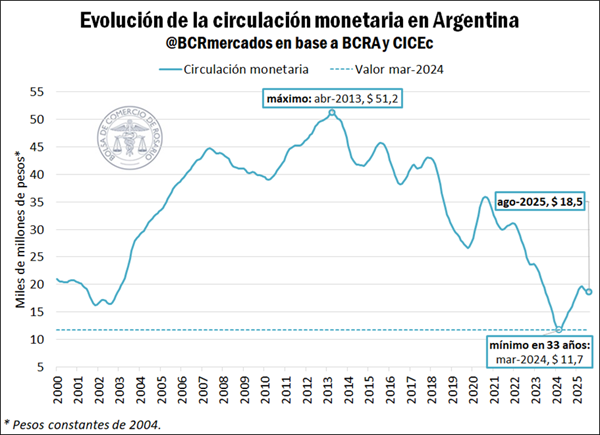 Observando los valores históricos, se advierte que la misma alcanzó su máximo en abril de 2013, para luego comenzar a caer, en el marco de un proceso inflacionario que se aceleró año tras año, con una inflación que llegó a situarse por encima del 25% mensual en diciembre de 2023. Como resultado, la circulación monetaria se contrajo de manera tal que en marzo de 2024 tocó su menor valor desde diciembre de 1991. A partir de entonces, con el inicio de un proceso de desinflación, la circulación monetaria comenzó a recuperarse de manera paulatina, ubicándose en agosto de 2025 un 58% por encima del mínimo de marzo del año previo. No obstante, se advierte que los últimos cuatro meses con datos disponibles, es decir, entre mayo y agosto, esta cuenta registró variaciones mensuales negativas, acumulando una contracción del 6% en dicho período.