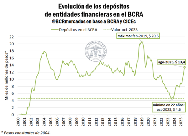 Por su parte, la cuenta de depósitos de las entidades financieras en el BCRA muestra el encaje de los depósitos en pesos. Dado que los bancos tienen la obligación de guardar como reserva una parte de los depósitos de las personas en el BCRA, mientras que la otra parte queda en los bancos para sus movimientos diarios, esta cuenta depende principalmente del coeficiente de encaje fijado por la autoridad monetaria, así como también de la magnitud de los depósitos del público en el sistema bancario.