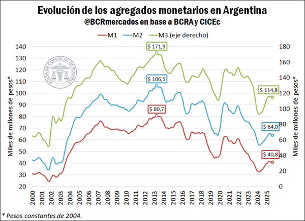 El primer agregado monetario se denomina M1, y está compuesto por la circulación monetaria de los particulares y los depósitos en cuenta corriente. Si al mismo se le suman los depósitos en caja de ahorro se obtiene el M2, mientras que al incorporar también los depósitos a plazo fijo se obtiene el M3. Dado que cada agregado más amplio incorpora los componentes del anterior, los tres suelen moverse en conjunto, registrando los mínimos y máximos en los mismos meses, o meses similares.