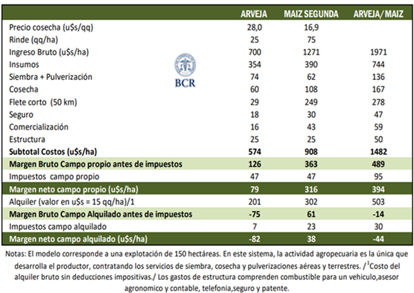 Considerando rindes promedios de 25 qq/ha para la arveja y 75 qq/ha para el maíz, la renta en campo propio asciende a 394 USD/ha, mientras que en campo arrendado se sitúa en negativo (–44 USD/ha). Si las productividades mejoran —por ejemplo, 30 qq/ha en arveja y 80 qq/ha en maíz—, el margen trepa a 511 USD/ha en campo propio y 108 USD/ha en arrendado.