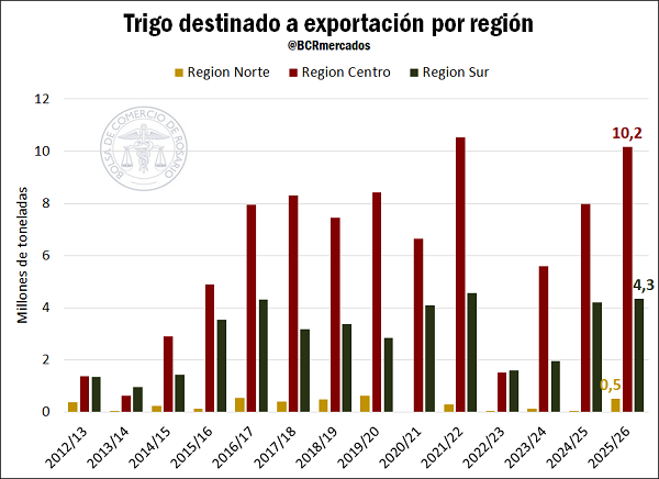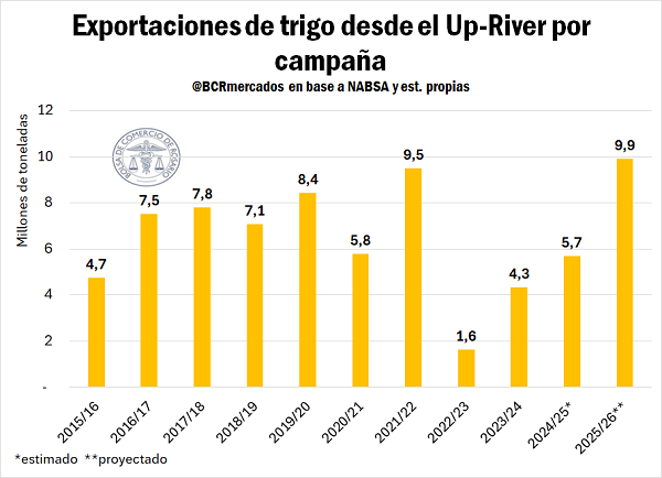 Por su cercanía geográfica a los puertos, las exportaciones de la Región Centro y Norte son las que se despacharían desde las terminales fluviales del Paraná, totalizando 10,7 Mt. Suponiendo que los embarques de los puertos del norte de la provincia de Buenos Aires (Zárate/Ramallo/San Nicolás) se mantengan en el rango de 800.000 t como en los últimos años, se estima que los puertos del Gran Rosario despacharán en la campaña 9,9 Mt, lo que podría significar un máximo histórico para el cereal desde la región.