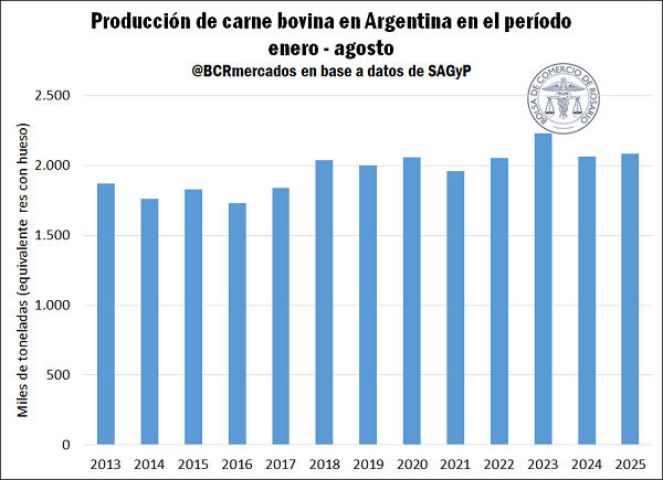 La producción de carne bovina se mantuvo en niveles elevados en los primeros ocho meses del año. Entre enero y agosto, se produjeron casi 2,1 millones de toneladas (equivalente res con hueso). Este registro es el segundo más alto desde el año 2010, solo superado en dicho período por la producción del año 2023, de faena acelerada por la sequía. El nivel producido, en tanto, está en línea con el promedio de los últimos cinco años para el mismo período, apenas un 0,5% por encima.