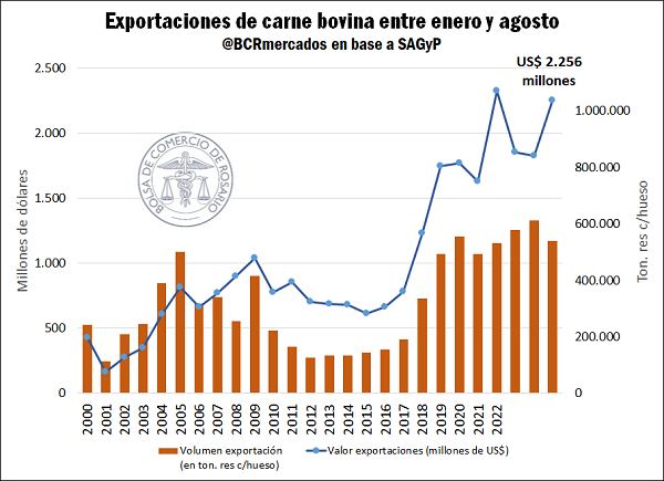 Gracias a ello, y a una demanda pujante también por parte de la Unión Europea, el valor exportado crece, a pesar de la caída en volumen, por un incremento de precios que promedia el 40% interanual para todo el período. En los primeros ocho meses de 2025, las exportaciones de carne vacuna se valuaron en US$ 2.256 millones, creciendo un 24% interanual y un 20% respecto al promedio de los últimos cinco años.