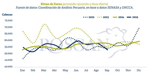 Lo cierto es que los datos anticipados por el ritmo de traslado de animales a plantas de faena ya han sido confirmados oficialmente, registrándose una faena de 1.169.120 cabezas en todo el mes. Si bien, en números absolutos, esta cifra representa prácticamente la misma cantidad de animales faenados en agosto, al llevarla a una base diaria —ajustada por la cantidad de días hábiles computables en cada período mensual— se observa una caída significativa: 8,3 % en relación con el mes previo y 7,7 % respecto de lo registrado un año atrás.