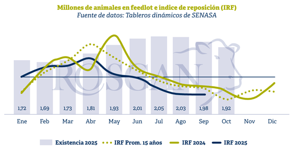 Al 1° de octubre, los datos informados por SENASA confirman existencias por un total de 1.915.612 vacunos, un 3 % menos que lo reportado el mes pasado, siendo este el tercer mes consecutivo en fase de vaciado. En concreto, durante el último mes, los corrales recibieron un total de 337.100 vacunos, al tiempo que registraron egresos por 442.442 animales, lo que refleja un Índice de Reposición de 0,76, un cociente muy similar al registrado en agosto.