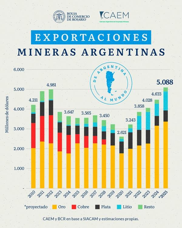 Fruto del trabajo conjunto entre la Cámara Argentina de Empresas Mineras (CAEM) y la Bolsa de Comercio de Rosario (BCR), se presenta a continuación una estimación anual de las exportaciones mineras de la República Argentina. Con dichas proyecciones se busca aportar previsibilidad a uno de los sectores estratégicos para el desarrollo económico argentino, en un contexto de creciente demanda global por minerales críticos para la transición energética.