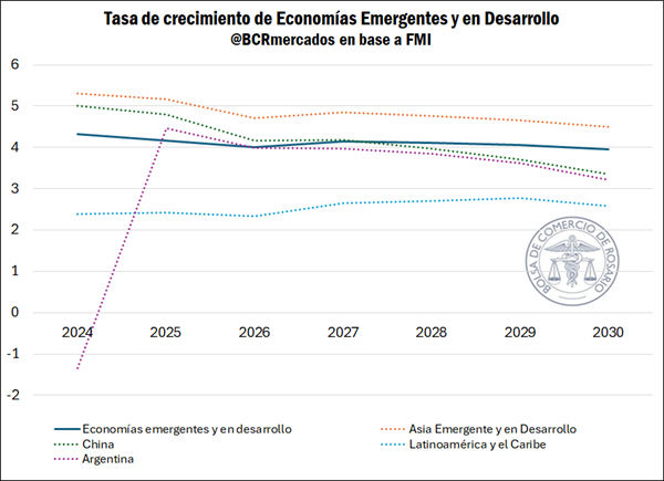 Por su parte, para América Latina y el Caribe, se proyecta un crecimiento estable de 2.4% en 2025 y 2.3% en 2026, reflejando los cambios en la política comercial; en el caso particular de Argentina, el organismo estima un crecimiento de 4,5% en 2025, lo que representa una reducción de un punto porcentual respecto de la proyección de abril, y una expansión del 4,0% para 2026, en ambos casos por encima del promedio de la región. En Europa emergente y en desarrollo, se prevé un crecimiento del 1.8% en 2025 y del 2.2% en 2026, mientras que en Medio Oriente y Asia Central se espera una aceleración del crecimiento debido al fin de las interrupciones en la producción de petróleo en países clave como Arabia Saudita. El grupo de países en desarrollo de bajos ingresos enfrenta el escenario más difícil, con un crecimiento débil y perspectivas socavadas por la disminución de los flujos de financiamiento externo y los recortes a la ayuda internacional.