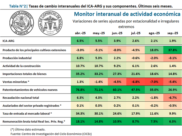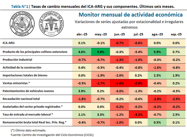Entre ellos se destacan la producción agrícola, las importaciones y las remuneraciones totales a los empleados registrados del sector privado. En contraposición, como puntos negativos resaltan caídas persistentes en la actividad industrial, la construcción y la recaudación nacional, además del deterioro en el empleo registrado durante los últimos meses.