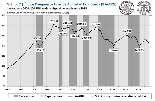 El Índice Compuesto Líder de Actividad de Argentina (ILA-ARG) también presenta un deterioro notorio desde febrero. En septiembre tuvo su séptima variación mensual negativa consecutiva, con una contracción del -0,3%.