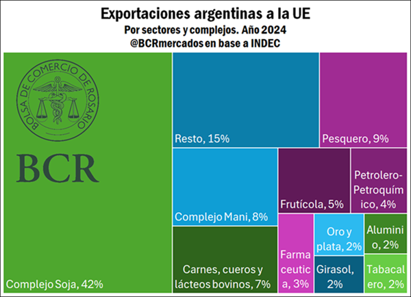 El 85% de las exportaciones argentinas a la UE son productos de las cadenas agroindustriales, tomando el promedio de los últimos 10 años. Dentro de ellas destacamos a la harina de soja, principal producto de exportación del comercio exterior argentino y a la Unión Europea.