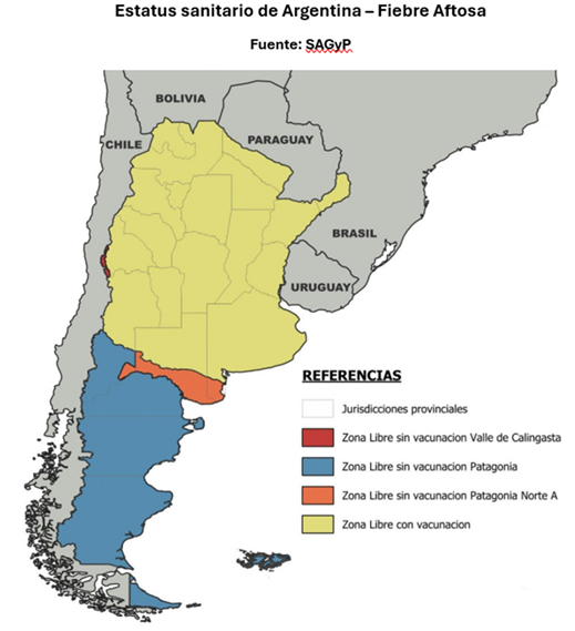 En el caso de Argentina, actualmente el organismo reconoce al país como un país “libre de aftosa (con o sin vacunación)”. Siguiendo a SAGyP, se identifican las siguientes zonas: