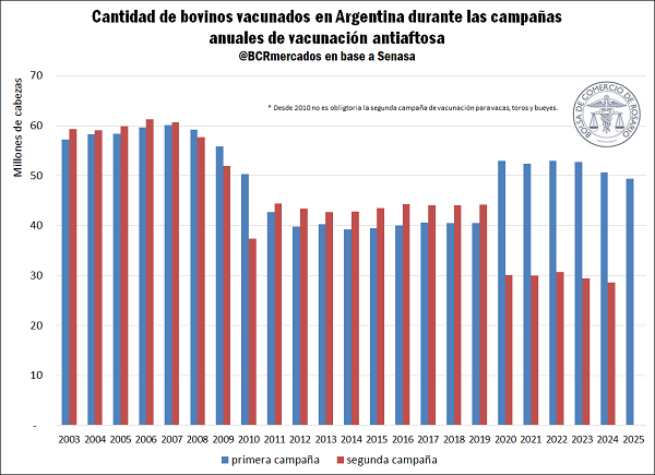 Un detalle que puede observarse en el gráfico es una caída en la segunda dosis de vacunación desde el año 2020 en adelante. Esto podría explicarse por el hecho de que, si bien desde 2010 ya no se exige una segunda dosis a los animales “adultos”, la misma se siguió aplicando en muchos casos. En 2019, pese a la falta de obligatoriedad se vacunó con la segunda dosis a 12,6 millones de ejemplares de la categoría “vaca”; en 2020 este número se volvió casi inexistente, disminuyendo a solo 14.583 vacas vacunadas, y bajando aún más en los años subsiguientes. Cabe mencionar que durante las campañas de vacunación se vacuna a las siguientes categorías: ternero, ternera, novillito, torito, vaquillona, novillo, vaca, buey y toro; quedando desde 2010 las vacas, bueyes y toros, es decir, los animales “adultos”, exentos de la obligatoriedad de la segunda vacunación. Además, a partir de la resolución 711/25 del SENASA, se profundizaría esta tendencia, y sólo sería obligatoria en la mayor parte de la zona libre con vacunación aplicar la segunda dosis a terneros y terneras, con vigencia a partir de 2026. La medida se enmarca en una estrategia general que busca que Argentina pueda mantener el estatus de país libre de aftosa, pero evitando la vacunación de ejemplares que ya recibieron previamente varias dosis o que están prontos a faenarse.