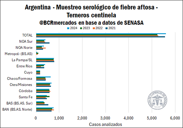 Por su parte, el Servicio Nacional de Sanidad y Calidad Agroalimentaria (SENASA), a través del Programa Nacional de Fiebre Aftosa, lleva adelante desde 2018 un muestreo anual en terneros centinela, animales jóvenes que no han recibido vacunación y que representan una población de alto valor epidemiológico. Se destaca que, este muestreo constituye una herramienta fundamental para demostrar la ausencia de circulación viral en la zona libre de fiebre aftosa con vacunación de la República Argentina.