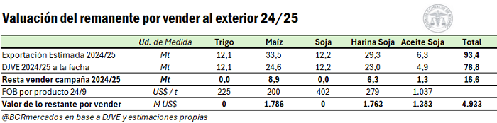 En primer lugar, partiendo de la estimación de exportaciones para la campaña 2024/25 de los principales productos de los tres complejos (trigo, maíz, soja y sus derivados), se tiene que el volumen total proyectado a despachar al exterior suma 93,4 Mt. De éstos, 76,8 Mt ya se han vendido, y registrada su respectiva Declaración Jurada de Venta al Exterior (DJVE) al 25 de septiembre. Si se valúa la mercadería que resta vender al exterior de la campaña 2024/25 al precio FOB de exportación vigente el miércoles 24/9, se estima que el valor total del trigo, el maíz, y el poroto, la harina y el aceite de soja que resta vender al exterior para cumplir con la proyección exportadora estimada para la campaña alcanza a US$ 4.933 millones.