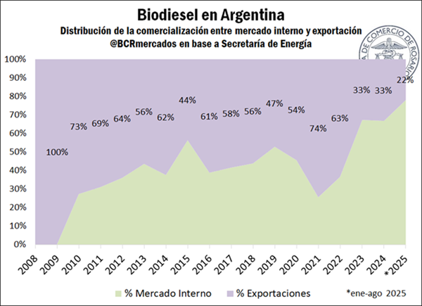 Con este contexto, el peso relativo del mercado argentino del biodiesel cambió sustancialmente. Mientras que a principios de la década pasada más del 70% de la comercialización se destinaba al exterior, en lo que va del 2025 la ecuación se invierte: el 78% corresponde al consumo doméstico y apenas el 22% a exportaciones. De esta manera, se registra para este año la participación más baja de las exportaciones en la producción de biodiesel de la que se tenga registro.