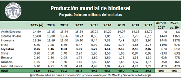 En 2017, año de su récord productivo, Argentina representaba el 7,8% de la producción mundial de biodiesel. Para 2019 dicha proporción se había reducido al 4,7%. Bajando aún más, para el 2020 ya totalizaba el 2,6%. Con las previsiones de producción global y Argentina de Oil World, la participación argentina en la producción global de biodiesel espera ubicarse en el 1,5% en 2025, un número similar a la participación de 2023, en medio de la histórica sequía.