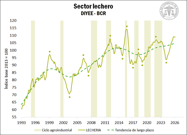 En lo que respecta al sector lechero, se evidencia que la producción de leche registró una leve contracción del 0,1% en febrero. De esta manera, el sector muestra cierto estancamiento en los últimos cuatro meses, luego de la fuerte expansión registrada entre 2024 y 2025. A pesar de ello, es el cuarto mejor febrero del que se tiene registro desde el inicio de la serie en 1983.
