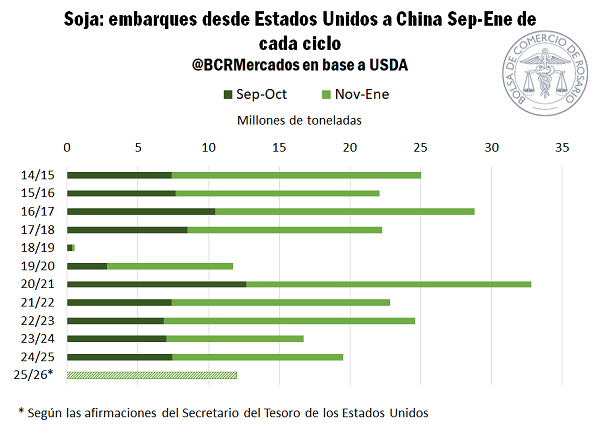 Sucede que los 12 Mt de compras anunciados desde aquí hasta enero se encuentran en línea con los desembarcos habituales de soja americana en estos meses. En efecto, dejando afuera el período de la primera guerra comercial, el promedio de los últimos 10 años es de 16 Mt, con un máximo de 20 Mt en la campaña 2020/21 y un mínimo de 10 Mt en la 2023/24. Mientras tanto, Estados Unidos se perdió las ventas de los primeros dos meses de su campaña, septiembre y octubre, cuando habitualmente le despacha alrededor de 8 Mt. Ello explica el sabor amargo que deja el acuerdo y la evolución que mostró el precio de referencia de la soja en Chicago.