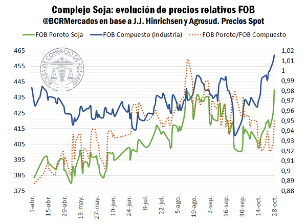 De la mano de la suba del poroto, es de destacar que las expectativas en torno al acuerdo también traccionaron los precios de la harina de soja, que escalaron un 15% durante octubre tocando su valor más alto desde marzo.